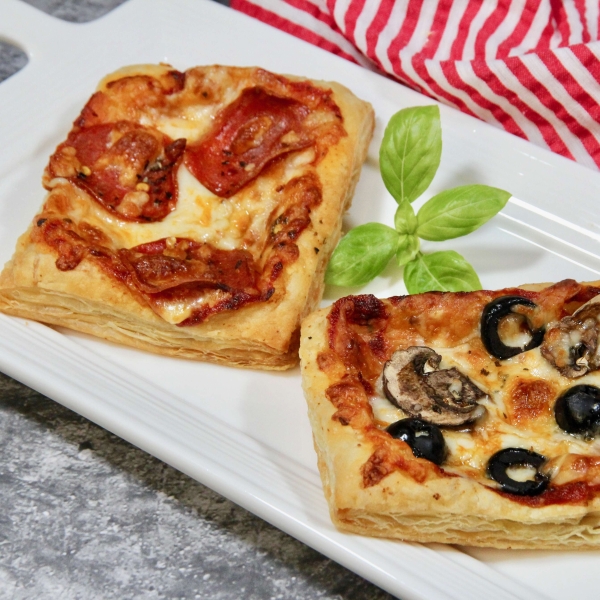 Cut puff pastry into squares to make these mini pizzas featuring a garlic-butter border and topped with Italian cheese and pasta sauce.