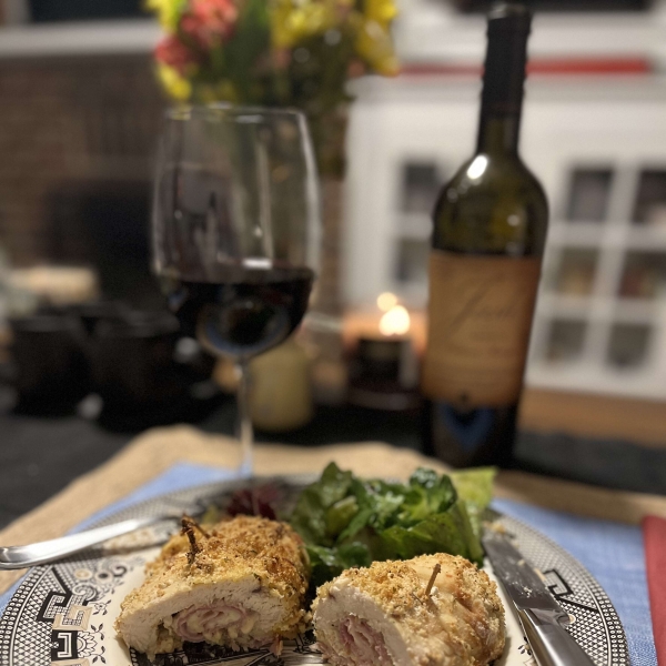 This air fryer chicken Cordon Bleu recipe featuring deli ham and gooey Swiss cheese is a deliciously crispy and satisfying main dish for two.