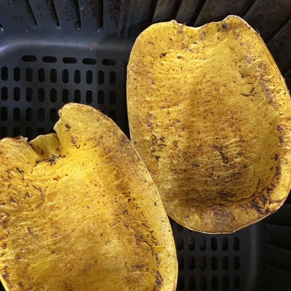 Preheat an air fryer to 360 degrees F (180 degrees C). Place spaghetti squash half skin side-down in the basket. Cook for 20 minutes.