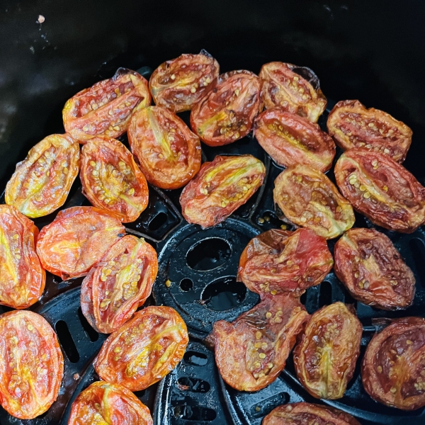 This past summer I found myself asking how I was going to preserve the abundance of grape tomatoes I had from my garden. Sun drying was the only thing I could come up with but problem was, there wasn't any sun. Air fryer to the rescue! I have a small air fryer so I wrote this up for 5 ounces (12 grape tomatoes) so that it would be easy to do in small batches. Store in an airtight container in the freezer for re-hydrating or pack in oil and store in the refrigerator for salads, soups, sauces, etc.