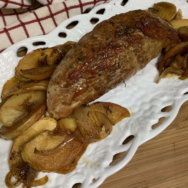 Bake loin in the preheated oven until an instant-read thermometer inserted into the center reads 145 degrees F (63 degrees C), 30 to 45 minutes. Allow tenderloin to rest for 10 minutes before slicing, and serve each slice with a spoonful of apple-onion mixture.