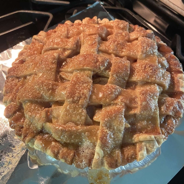 This apple pie recipe makes a caramelized lattice crust for sweet, buttery apple slices. Serve warm with ice cream for the perfect holiday dessert!