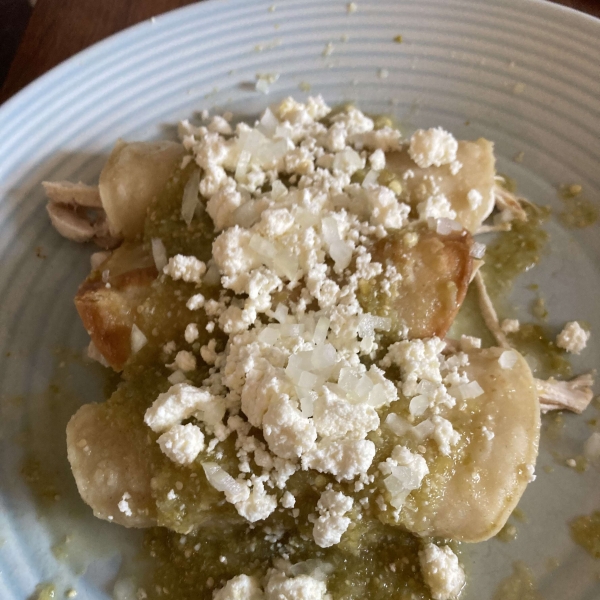 Fill or top tortillas with shredded chicken, then extra green sauce. Top with crumbled cheese, chopped onion, and chopped cilantro.