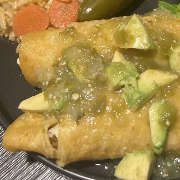 This authentic chicken enchilada recipe features warm tortillas and shredded meat topped with salsa verde made with tomatillos, serranos, and garlic.
