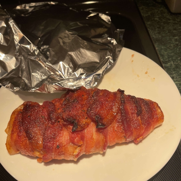 Slices of crispy bacon are coated in a brown sugar glaze and wrapped around spiced chicken breasts in this quick and easy recipe.