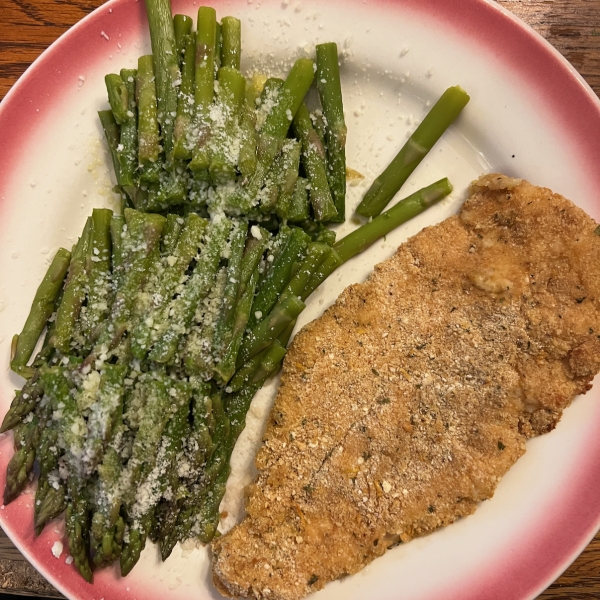 Dredge one piece of chicken in flour; shake off excess. Dip into beaten egg. Lift up so excess egg drips back in the bowl. Press into bread crumbs to coat both sides. Place the breaded chicken, unstacked, onto a plate. Repeat with remaining chicken.