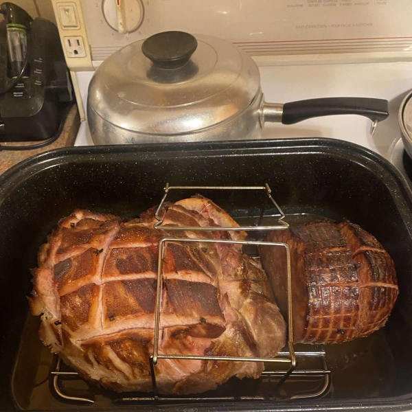 Preheat the oven to 350 degrees F (175 degrees C). Place ham in a large roasting pan; press cloves into the top at 1- to 2-inch intervals.