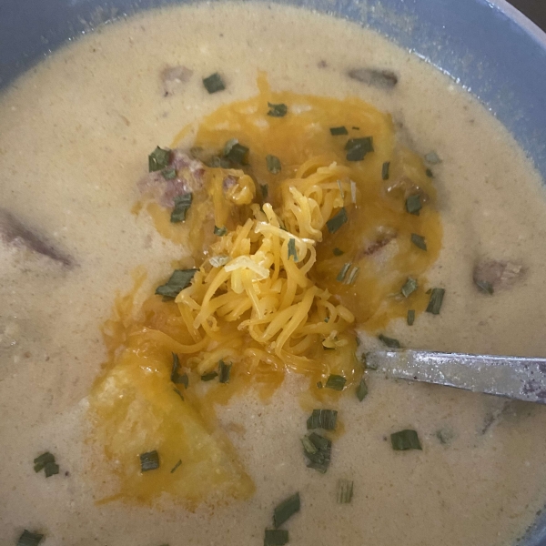 This creamy baked potato soup with crispy bacon bits and shredded Cheddar is a delicious way to use leftover baked potatoes to feed a hungry family!