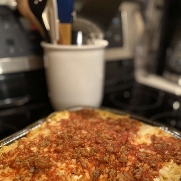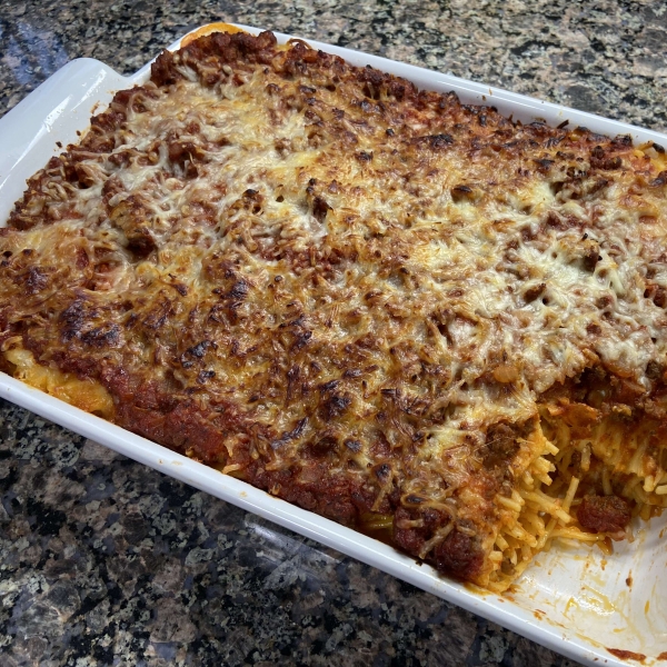 This baked spaghetti recipe is comfort food at its best. Layers of spaghetti, meat sauce, and melted mozzarella make this a perfect weeknight dinner.
