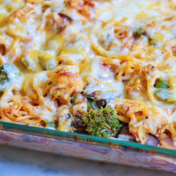 While vegetables are cooking, bring a large pot of lightly salted water to a boil. Add pasta and cook for 8 to 10 minutes or until al dente; drain. Return pasta to pot and add chicken mixture and spaghetti sauce. Stir. Pour mixture into 9x13 inch pan. Top with shredded cheese.