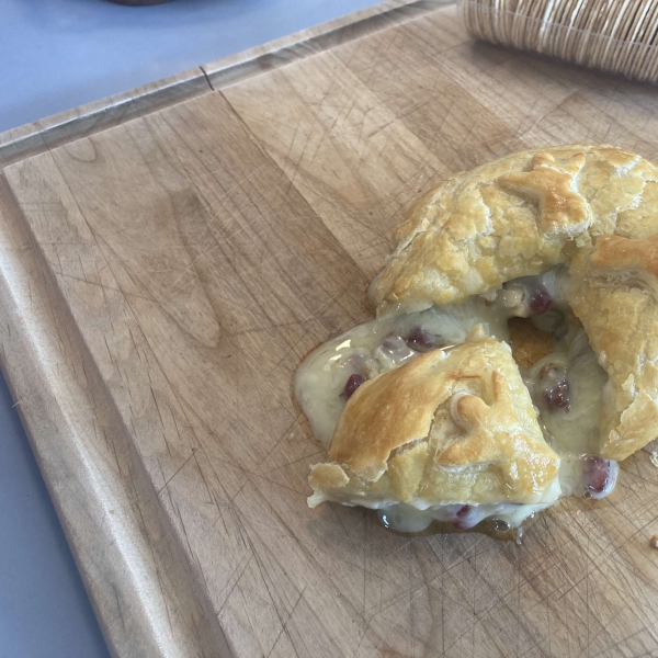 Roll out puff pastry on a floured surface to about 1/8-inch thickness. Place brie in the center of pastry. Gently pull up edges to ensure there is enough dough to entirely wrap brie. Trim off the corners if there is too much dough.