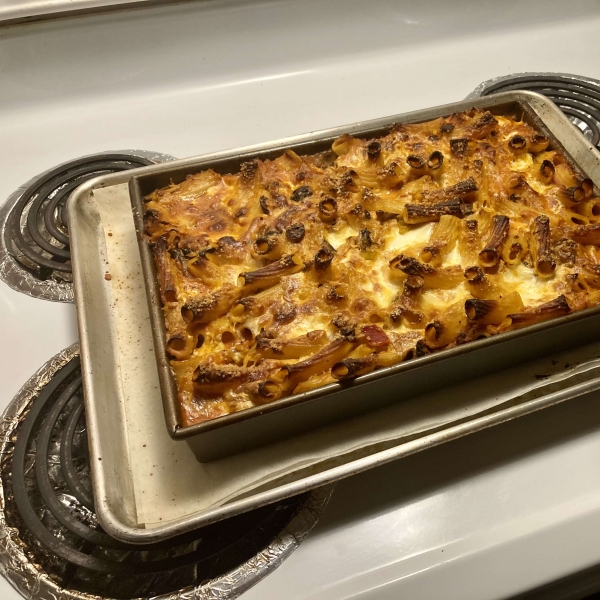 Meanwhile, bring a large pot of lightly salted water to a boil. Cook rigatoni in the boiling water, stirring occasionally, about 10 minutes. Drain.