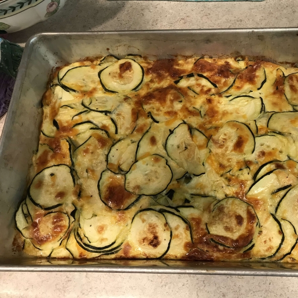 Bake in the preheated oven until zucchini is fork-tender and top is golden brown, about 45 minutes.