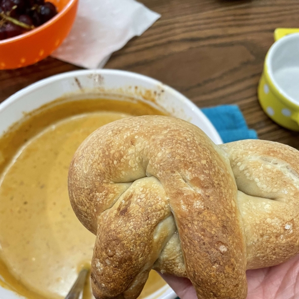 Roll the dough into a rope 15 to 18 inches long, with the center (belly) of the rope being twice as thick as the ends. Cross the ends once or twice and fold them back over the pretzel so the ends are just past the belly. Repeat to form remaining pretzels.