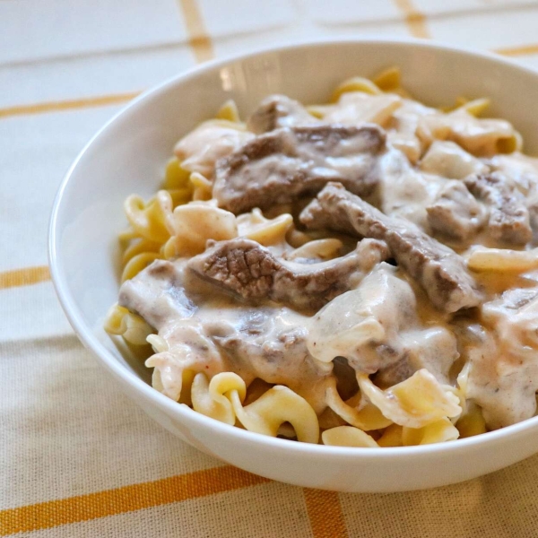 This creamy, tasty beef stroganoff is made with sirloin steak, mushroom soup, paprika, and nonfat sour cream for a lighter version of the traditional dish.