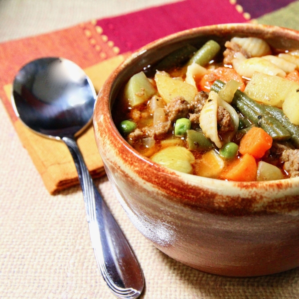 This beefy vegetable soup is perfect if you are feeding a crowd, but can easily be scaled down.