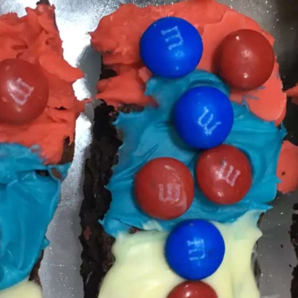 Remove brownies from the refrigerator. Spread red-colored chocolate over the top in a stripe. Sprinkle with 1 tablespoon red and blue candy-coated chocolate pieces before it hardens.
