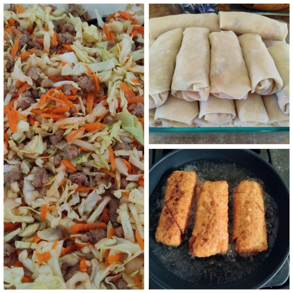 Fry egg rolls in the hot oil, turning occasionally, until golden brown and crispy, 5 to 8 minutes. Remove from oil and drain on paper towels or rack.