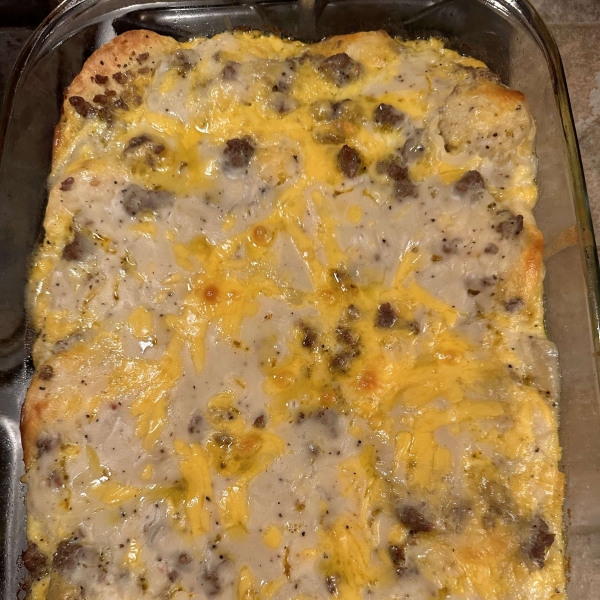 A biscuits and gravy casserole recipe to make for any meal. Biscuits, eggs, gravy, sausage, and cheese are baked together for ultimate comfort food.