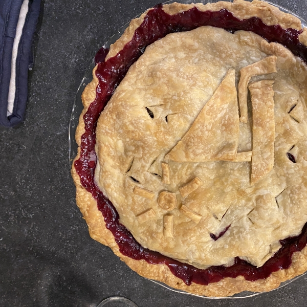 Bake in the preheated oven on the baking sheet for 15 minutes; reduce the heat to 350 degrees F (175 degrees C) and bake 35 minutes longer. Remove the foil and continue baking until the crust is golden and juice is bubbling through the slits, about 15 minutes more. Cool completely before serving.