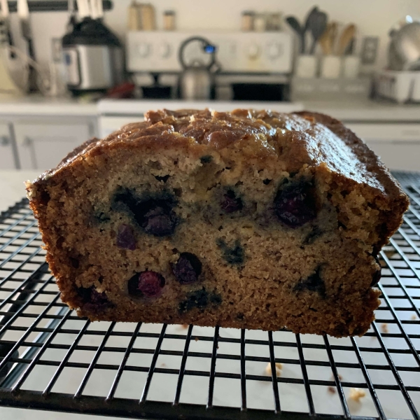 This banana blueberry bread is made with mashed ripe bananas and fresh blueberries for a delicious morning baked treat or quick afternoon snack.