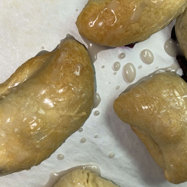 Dust turnovers with remaining confectioners' sugar. Drizzle with vanilla frosting.