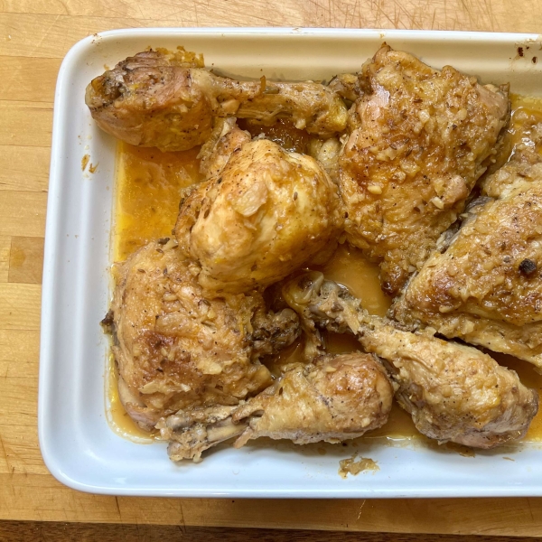 Cover and bake in the center of the preheated oven for 1 hour. Remove from the oven, remove the lid, and baste chicken.