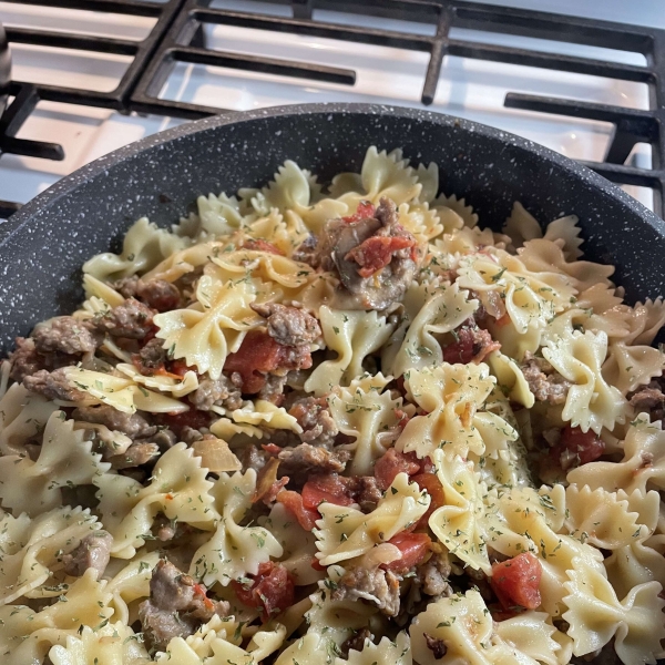 A tasty creamy sausage pasta dish. Sweet Italian sausage is simmered with tomato, garlic, onion, and cream for a rich sauce served over bow tie pasta.