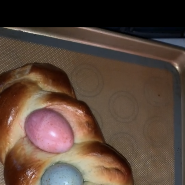 This decorative Easter bread has whole eggs baked into it! Do not cook the whole eggs, as they will bake at the same time that the bread does. The eggs can also be dyed for extra color.