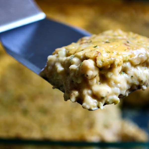 Broccoli is baked with rice, bacon, onion, cream of chicken soup and processed cheese sauce.
