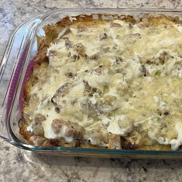 This brunch on the bayou is made with French bread, Italian sausage, two kinds of cheese, and white wine for a tasty make-ahead breakfast casserole.
