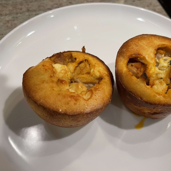 Transfer the rested batter into a liquid measure. Pour into the prepared muffin cups, filling each about halfway full. Spoon some Buffalo chicken into each cup then sprinkle blue cheese over top.