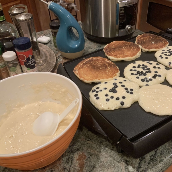 Pour or scoop the batter onto the preheated griddle, using approximately 1/2 cup for each pancake. Cook until bubbles appear on the surface, 1 to 2 minutes; flip with a spatula and cook until browned on the other side. Repeat with remaining batter.