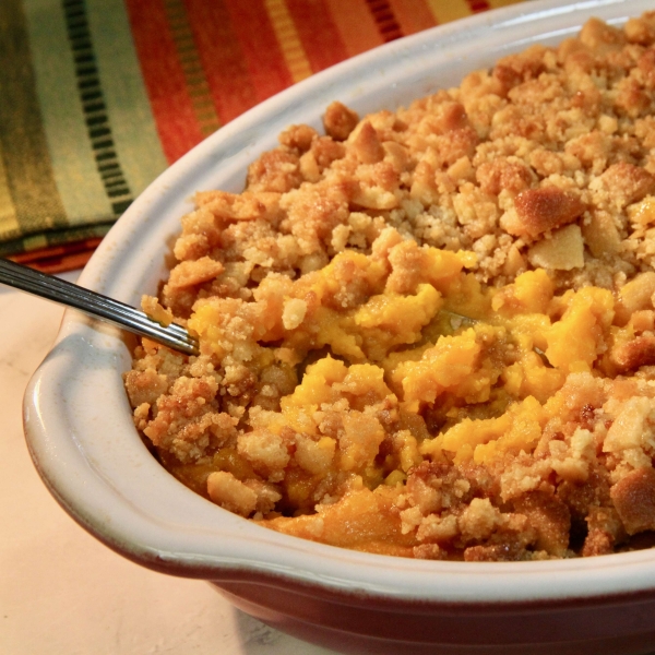 This butternut squash casserole has a custard-like texture and is topped with a buttery brown sugar crust for a delicious side to holiday roasts.