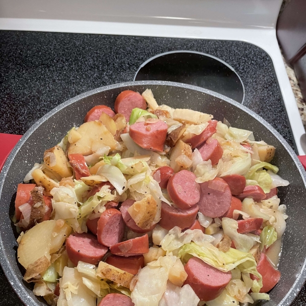 Add kielbasa, vinegar, salt, and pepper; cook over low heat, stirring occasionally until cooked through. Pour water into the pan, cover, and cook another 10 minutes before serving.
