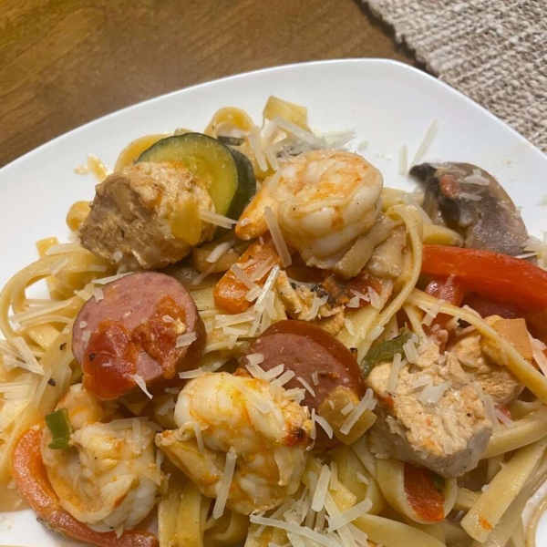 This flavorful Cajun-inspired pasta dish is chock full of chicken, shrimp, sausage, tomatoes, and veggies seasoned with Cajun spices.