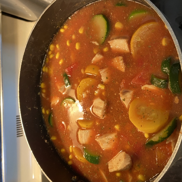 Chicken thighs simmer with corn, calabaza squash, and other veggies in a zesty tomato sauce for this Mexican main dish.