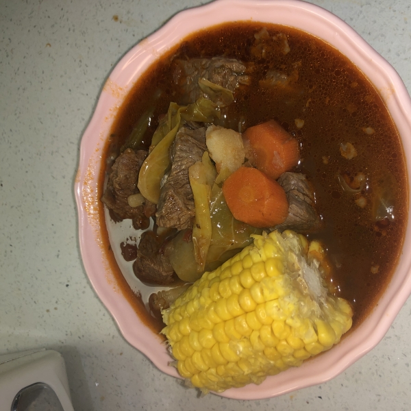 This is an extremely hearty and satisfying soup, made from scratch with beef bones, cabbage, potatoes, corn, chayote, and cilantro. Garnish with slivered raw onion, lime juice, jalapenos, and more cilantro.