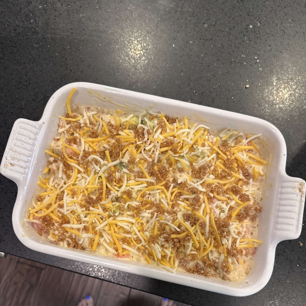 This Campbell's chicken and broccoli casserole features cooked meat, condensed soup, and Cheddar cheese baked with a buttery bread crumb topping.