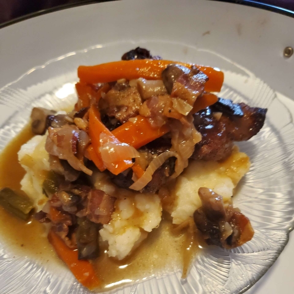 Coq au vin is a rich French chicken stew made with bone-in, skin-on chicken thighs braised in a red wine broth with bacon, mushrooms, and thyme.