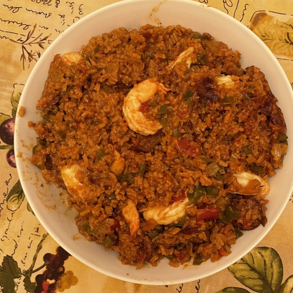 Shrimp jambalaya with sausage is a comforting dish, stewed full of flavor, with rice cooked right in with the other ingredients for a hearty meal.