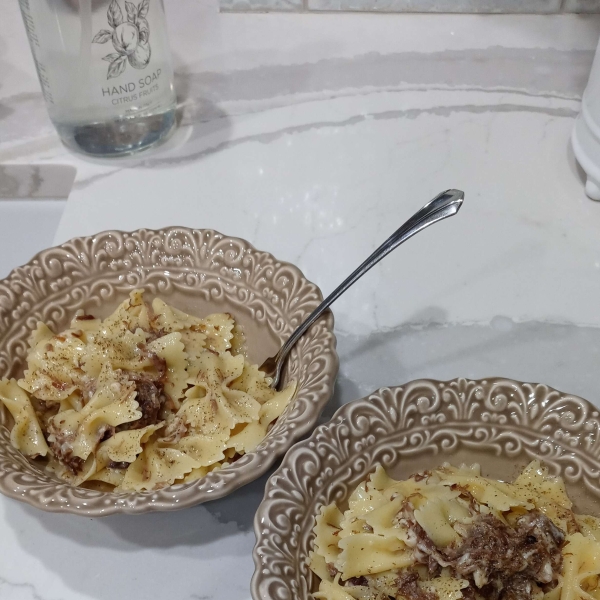 Slowly pour egg mixture into the pasta mixture; cook, stirring constantly until the egg mixture forms a thick sauce, 1 to 2 minutes. Remove from heat.