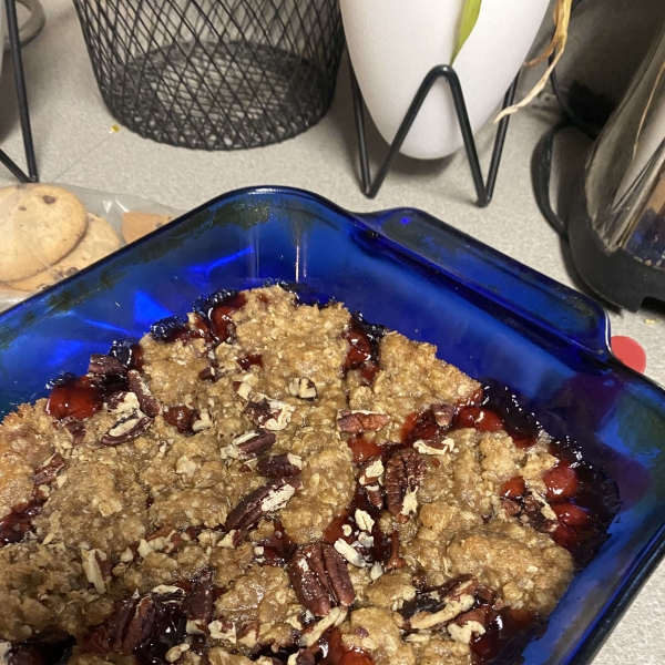 This cherry crisp is simple to make with canned pie filling topped with a crunchy oat, brown sugar, and pecan crumble for a quick, delicious dessert.