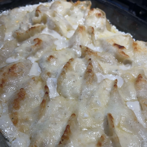 Add 1 cup sauce to the bottom of a 9x13-inch baking dish.