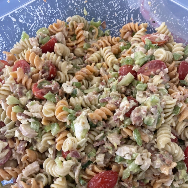 This chicken pasta salad has all the delicious fixings for a chicken club sandwich combined with tender pasta and a rich and creamy dressing.