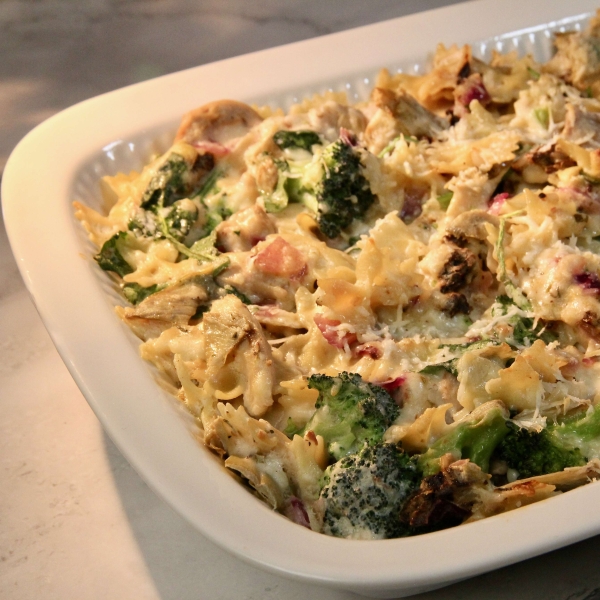 Made with a cheesy cream sauce, this chicken Florentine casserole with farfalle pasta and veggies makes good use of leftover chicken.