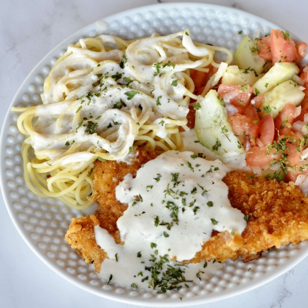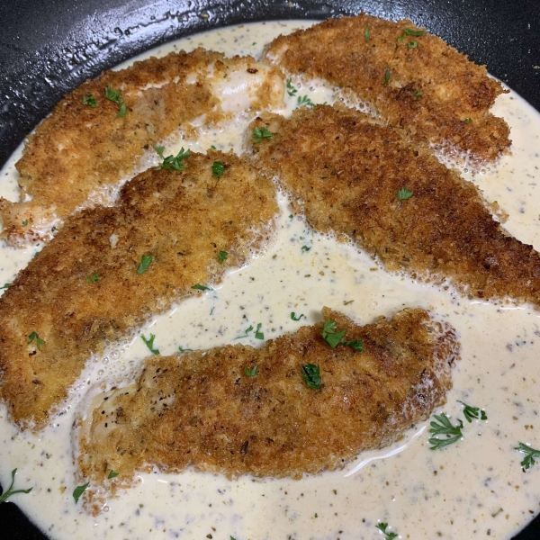 In this chicken Parmesan recipe chicken tenders are breaded with a savory Parmesan crust and served in a delicious cream sauce.