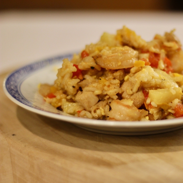 Chicken, shrimp, bell peppers, carrots, and rice are stir-fried in a garlic-soy sauce and then baked inside a hollowed-out pineapple.