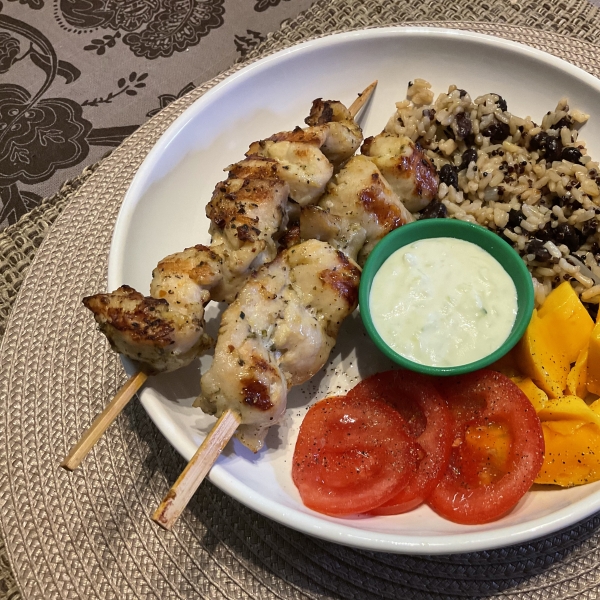 Cook the skewers on the preheated grill, turning frequently until browned on all sides and chicken is no longer pink in the center, about 7 to 8 minutes per side. Serve with tzatziki sauce.