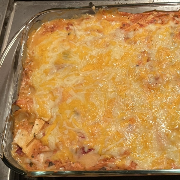 Alternating layers of tortillas, chicken and a tangy green chile cream sauce (easily made with canned soups), and oozing with melted Cheddar cheese.